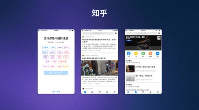 知乎的Logo是藍色,代表了高科技、智能、可靠(開課吧也是藍色)。特別在首頁,用黑白灰表現(xiàn)出簡潔、質感,讓內容沉淀在頁面里。這樣就很好地表現(xiàn)出這款產品的定位:高品質內容問答社區(qū)。