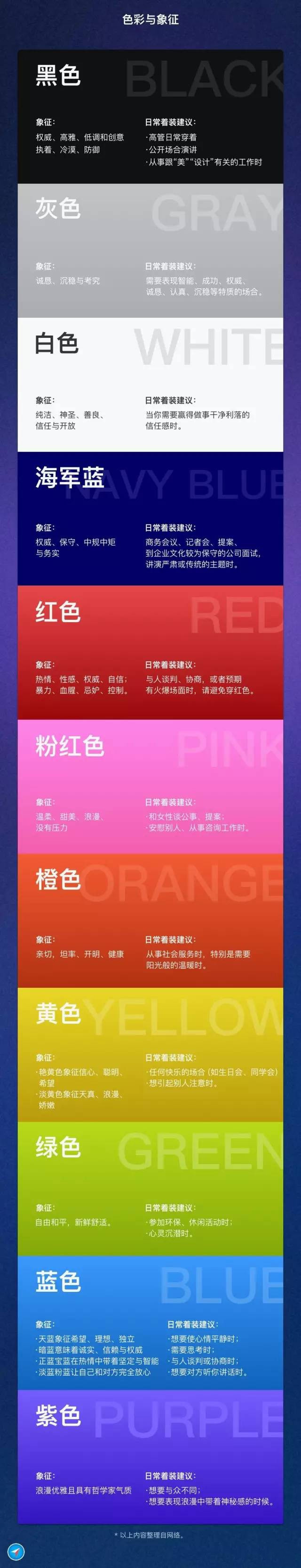 現(xiàn)在,我們就來看看目前公認的,每種色彩的象征意義(下次約會,你想好穿什么顏色的衣服了嗎?)。