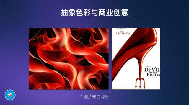 我們看左邊的火焰,圖片用艷麗的紅、黃、黑和流線的形態(tài),表現(xiàn)出燃燒的澎湃與焦灼,傳達出活力、自信、神秘的感覺。