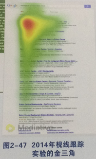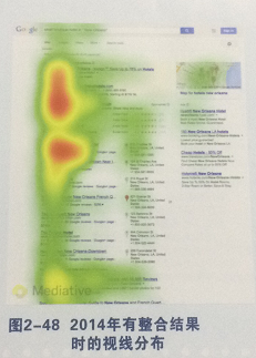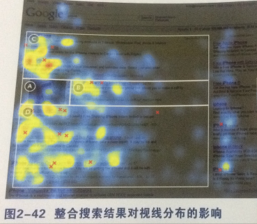 Mediative也給出了點(diǎn)擊數(shù)據(jù),排在第一的結(jié)果得到了34%的點(diǎn)擊,比2006年有所降低,和其他點(diǎn)擊統(tǒng)計一樣。前4位結(jié)果共得了76%的點(diǎn)擊,略有上升,但在誤差范圍內(nèi)。當(dāng)有廣告 地圖 圖片等結(jié)果出現(xiàn)時,視線分布產(chǎn)生了較大變化如上圖2--48。