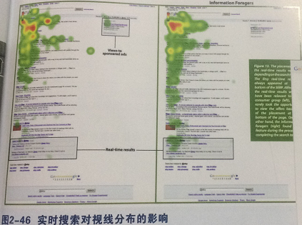 實驗表明用戶視線不再形成于左上角的金三角,由于第一個自然結(jié)果往往不在左上角,用戶開始在其他別的地方尋找自然結(jié)果。同時,橫向瀏覽減少,縱向瀏覽大大增加,用戶已經(jīng)知道質(zhì)量高的自然結(jié)果不一定在頁面的固定位置,所以開始習(xí)慣于更快速的瀏覽,更快速的找到自己感興趣的結(jié)果。用戶在頁面上瀏覽的結(jié)果數(shù)有所增加,但瀏覽每個結(jié)果的時間降低,2005年每個結(jié)果看了將近2秒,2014年縮短到1. 17秒。