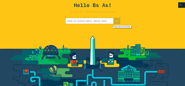 JSConf是一個(gè)為javascript約定制作的網(wǎng)站。它有一個(gè)有趣和富有創(chuàng)意的卡通設(shè)計(jì),有各種顏色和動(dòng)畫。