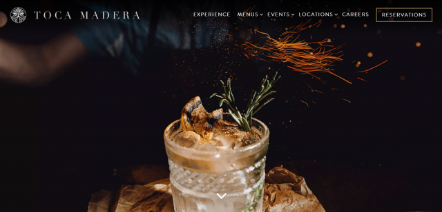 墨西哥Toca Madera餐廳網(wǎng)站主頁幻燈片上的每張圖片都有深色背景,幫助餐廳名稱的白色字體脫穎而出,讓網(wǎng)站保持一致的基調(diào)。