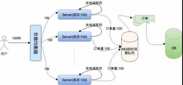 然后我們每臺機(jī)器本地庫存 100 張火車票,100 臺服務(wù)器上的總庫存還是 1 萬,這樣保證了庫存訂單不超賣,下面是我們描述的集群架構(gòu):
