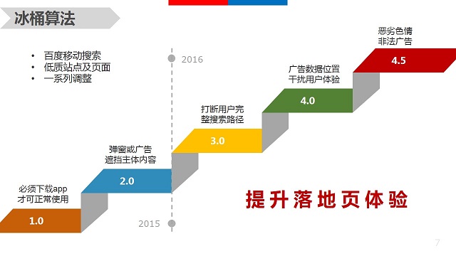 冰桶算法,初次推出是2014年,主要打擊移動(dòng)端影響用戶體驗(yàn)的落地頁行為,從最初的嚴(yán)懲強(qiáng)制下載APP的強(qiáng)盜行為,到2016年算法已經(jīng)精準(zhǔn)到落地頁廣告位置、內(nèi)容,百度搜索為了提供移動(dòng)端更好的用戶體驗(yàn),真是操碎了心。