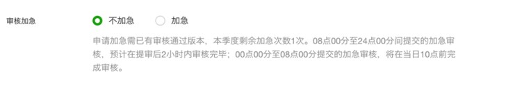 需要注意的是,申請加急需已有審核通過版本。只有當(dāng)小游戲更新版本時,才能申請加急審核。同時,是否能申請加急審核也與加急次數(shù)有關(guān)。