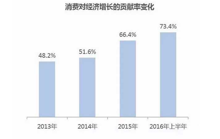 從 宏觀大環(huán)境來看,2016 年國民經(jīng)濟延續(xù) 2015 年的中高速增長,GDP 增速難以逾越 7% 大關(guān)。與此同時,消費占經(jīng)濟增長的比率逐年提升,2016 年上半年達到 73.4%,成為經(jīng)濟增長的重要引擎。在經(jīng)濟進入中高速增長的新常態(tài)下,供給側(cè)改革創(chuàng)新與居民消費升級的趨勢顯現(xiàn)。