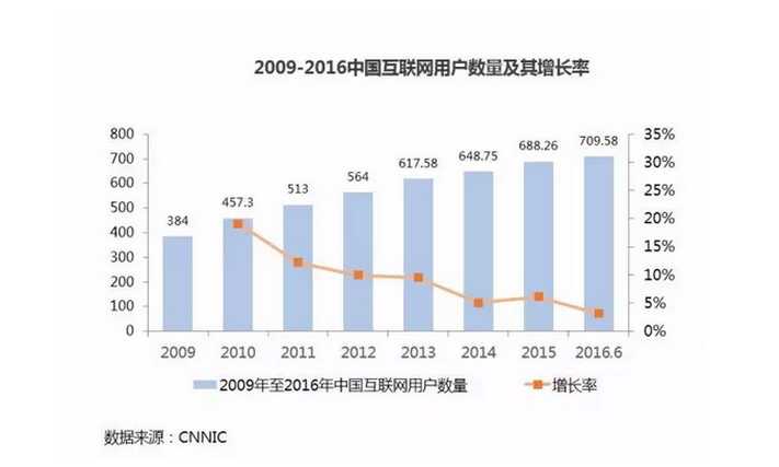 互聯(lián)網(wǎng)行業(yè)在推動供給側(cè)改革創(chuàng)新與居民消費升級中扮演的角色越來越重要。但是,互聯(lián)網(wǎng)在經(jīng)歷五年高速發(fā)展后在 2016 年進入了深水區(qū),互聯(lián)網(wǎng)用戶增長率明顯放緩,中國遇到網(wǎng)民紅利危機。