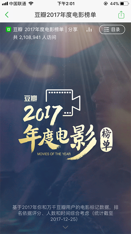 豆瓣電影在年末時(shí),發(fā)布了2017年度電影榜單。眾所周知,豆瓣電影的評(píng)分板塊成了大多數(shù)影迷們看電影前的排雷指導(dǎo),而這一份年度榜單的發(fā)布,更是吸引到影迷們圍觀。2017年就要過(guò)去了,在這一年內(nèi),有什么好電影,你看過(guò)了哪些,又錯(cuò)過(guò)了哪些。這一份榜單的意義就在于此。