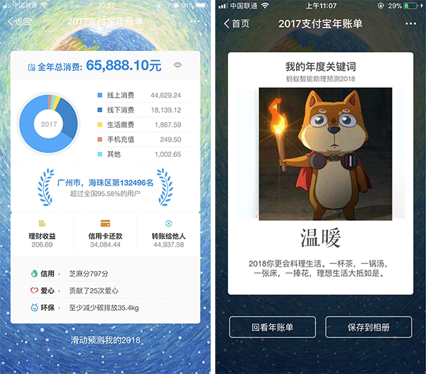 我們回到支付寶的年度賬單中,用戶分享得最多的就是如下兩張圖片: