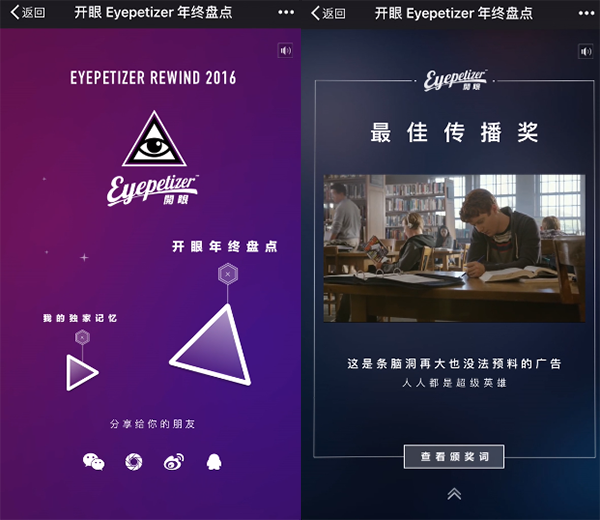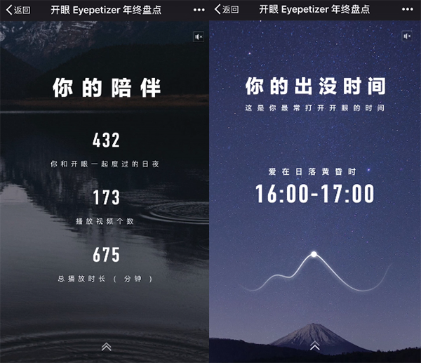 在2016年,開(kāi)眼APP就做過(guò)「查看Ta的記憶碎片」年終盤(pán)點(diǎn)H5,透過(guò)這個(gè)H5,用戶可以知道,這一年內(nèi),哪一些短視頻的關(guān)注度高。既然關(guān)注度那么高,必定就是備受好評(píng)的短視頻,不妨再次觀看一番,開(kāi)眼APP在盤(pán)點(diǎn)的同時(shí),還為用戶提供了觀看功能,喚起用戶觀看視頻時(shí)的一些記憶。