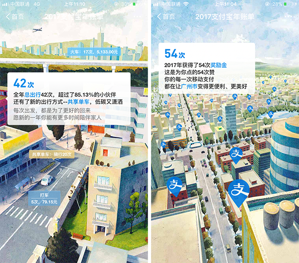 支付寶年度賬單向用戶展示年度花費(fèi)去向的同時(shí),告知用戶每次線上支付,為所在的城市做出了什么貢獻(xiàn)。