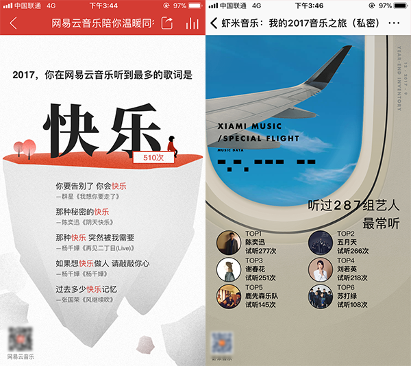 網(wǎng)易云音樂(lè)和蝦米這兩款音樂(lè)類APP,同樣的也對(duì)用戶過(guò)去一年的數(shù)據(jù)進(jìn)行了盤(pán)點(diǎn)。在網(wǎng)易云音樂(lè)的數(shù)據(jù)盤(pán)點(diǎn)中,清楚的呈現(xiàn)出用戶的喜好,除了將用戶年度最愛(ài)的前十首音樂(lè)排列出來(lái),還統(tǒng)計(jì)出用戶的年度關(guān)鍵詞,以此刺激用戶分享。