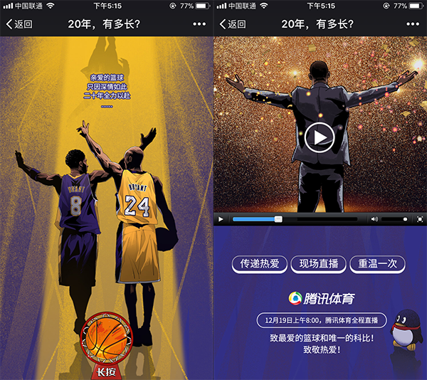而騰訊體育的「20年,有多長(zhǎng)」這一類H5營(yíng)銷,目標(biāo)群體是科比的粉絲,與粉絲們共同回憶科比職業(yè)生涯的點(diǎn)滴,令他們想起喜歡科比的那段歲月。