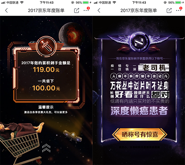 就在前幾天,京東悄悄上線了賬單功能,但卻沒(méi)有人曬出自己的賬單。盒子菌前去體驗(yàn)了一番,感覺(jué)這份賬單有點(diǎn)像用戶的年度統(tǒng)計(jì),羅列出用戶年度購(gòu)買了什么商品,省下了多少錢(qián),喜歡什么,最后為用戶頒布一個(gè)稱號(hào),然后就這么結(jié)束了。從功能上來(lái)說(shuō),確實(shí)是告知用戶這一年花費(fèi)了多少錢(qián),使用到了什么地方,但沒(méi)有激發(fā)用戶分享的欲望。準(zhǔn)確來(lái)說(shuō),就是沒(méi)有滿足用戶自戀心理。