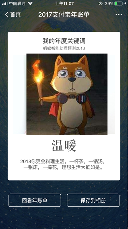 根據(jù)用戶2017年賬單詳情,預(yù)測(cè)用戶在2018年的關(guān)鍵詞,從其他人分享的圖片來(lái)看,這些關(guān)鍵詞包含“旺”、“愛(ài)”、“溫暖”、“小確幸”等較為溫暖系列的詞語(yǔ),下方對(duì)詞語(yǔ)的解釋盡是對(duì)美好生活的描繪,在新年伊始,為用戶展望未來(lái)。不同的人預(yù)測(cè)結(jié)果不同,用戶更樂(lè)于分享出去,為的是告訴其他人,自己未來(lái)一年是什么樣的。這也就是為什么,關(guān)鍵詞預(yù)測(cè)這一張圖片的分享量會(huì)比全年消費(fèi)總額圖片更高。