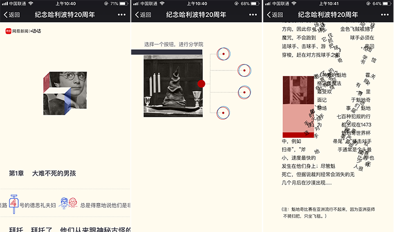 在《哈利波特》20周年之際,網(wǎng)易新聞APP發(fā)布了「紀(jì)念哈利波特20周年」的H5頁(yè)面,用戶通過(guò)滑動(dòng)屏幕,查看內(nèi)容。魁地奇球場(chǎng)、魔法課堂等熟悉的場(chǎng)景一一被呈現(xiàn)出來(lái)。該H5頁(yè)面并非單一的內(nèi)容展示,用戶根據(jù)屏幕提示進(jìn)行操作,讓人覺(jué)得自己好像正在閱讀一本魔法小說(shuō)。