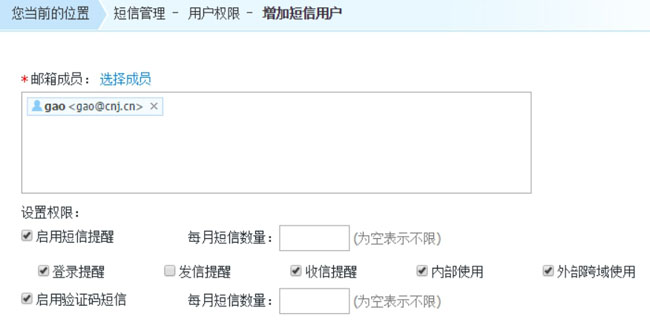 “應用管理”-“短信管理”,選擇“用戶權限”