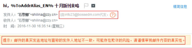 a)?看到有提示代發(fā)的(即實際發(fā)件人地址和郵件頭部聲明的發(fā)件箱不一致的情況),如下范例: