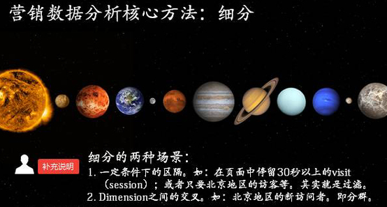 細(xì)分有兩類,一類是一定條件下的區(qū)隔。如:在頁面中停留30秒以上的visit(session);或者只要北京地區(qū)的訪客等。其實(shí)就是過濾。另一類是維度(dimension)之間的交叉。如:北京地區(qū)的新訪問者。即分群(segmentation)。