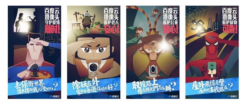 1. 百度云攝像頭的幾張大海報,幾個關(guān)鍵詞:隨時、安心、放心、可靠,海報中的人物都是家喻戶曉的superstar,并且整個頁面有一定的故事性和想象空間,讓人印象很深刻,并且調(diào)起了好奇心。