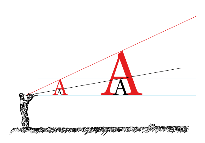 下面的圖案顯示了,當(dāng)你的正文字體離你的身體越遠(yuǎn),需要的字體更大。兩個黑色的和兩個紅色的A有一樣的度量尺寸。但是因?yàn)橛疫叺囊桓北荒迷诟h(yuǎn)的位子,感受到的尺寸會更小。右邊紅色的A和左邊黑色的A在感受上一樣的尺寸: