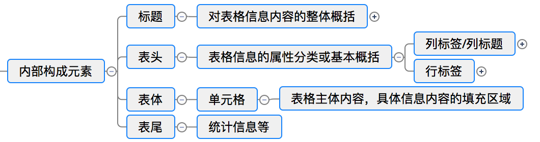 內部構成元素包括標題、表頭、表體、表尾等。標題是對表格信息內容的整體概括,可包含數據來源及屬性(日期、地區(qū)等),以便用戶對表格內容有整體認知。表頭一般指列標簽,這里也指首列行標簽,是對所屬行或列信息的描述。表尾一般是統(tǒng)計信息,例如總計、平均數等。