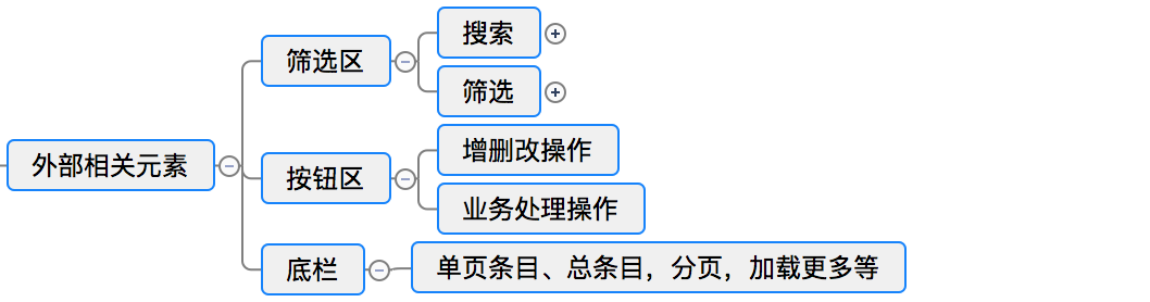 外部相關元素包括篩選區(qū)、按鈕區(qū)、底欄等。篩選區(qū)包含模糊搜索和條件篩選。按鈕區(qū)的按鈕可分為增刪改操作和業(yè)務處理操作。底欄一般放統(tǒng)計信息、分頁等內容。