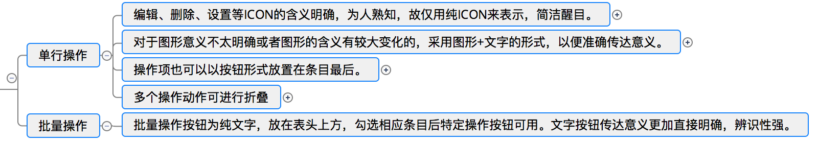 單行操作和批量操作。對于單條數據操作頻繁的場景,操作項不多于三個時,操作項跟在條目后面,常見操作僅用ICON,不常見操作用ICON+文字,當超過三個時,建議將操作折疊收起。對于數據批量操作頻繁的場景,建議將操作放到表格頂部,與勾選操作配合使用。