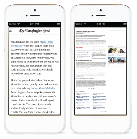 這個問題在手機(jī)上有所延伸。對用戶來說在一個小的明亮的屏幕上閱讀是一件很頭疼的事情。比較好的做法是在手機(jī)上每行顯示30-40個字符。下面是在智能手機(jī)上看到的兩個網(wǎng)站,第一個使用了30-40個字符,而第二個使用了為臺式機(jī)設(shè)計(jì)的網(wǎng)站上的尺寸。