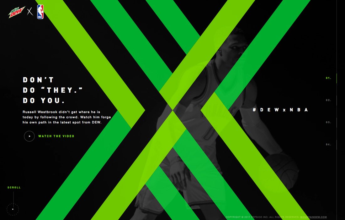 有些品牌在設計LOGO的時候就采用了霓虹色,在進行相應的網頁和廣告設計的時候,就不應該避開這一元素。就像 Mountain Dew 一樣,充分利用霓虹色的特點,大膽地投入到視覺設計中去。由于絕大多數的網頁不會這樣去用色,擁有霓虹色的網頁無疑就可以通過這種差異,脫穎而出。