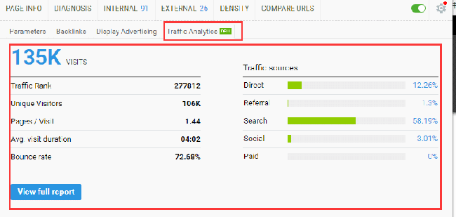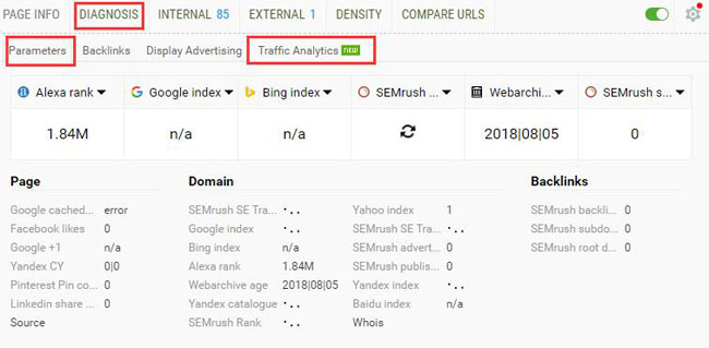 第二塊功能:打開某個頁面之后,點擊瀏覽器右上角,SEO Quake小圖標(biāo),我們可以查看這個頁面及其這個網(wǎng)站的詳細(xì)SEO信息,其中比較重要的是Parameters、Traffic Analytics和DIAGNOSIS: