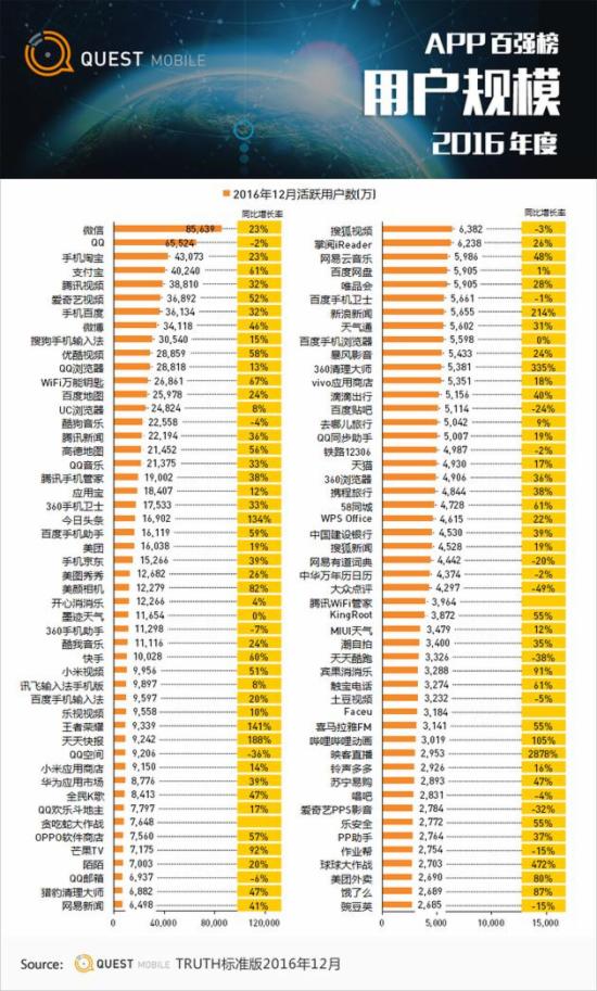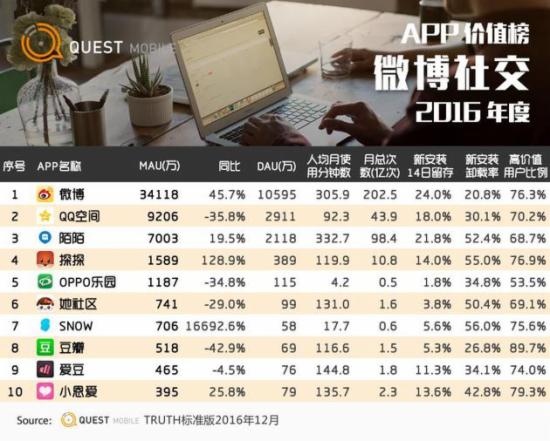 國內(nèi)移動大數(shù)據(jù)服務(wù)商QuestMobile發(fā)布2016年度報(bào)告——“2016年度App價(jià)值榜”,數(shù)據(jù)顯示,2016年12月,微博月活躍用戶數(shù)再次實(shí)現(xiàn)46%的增長,在所有App中排名第8位,其中高價(jià)值用戶比例高達(dá)76.3%。