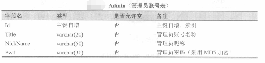 在教程內(nèi)容管理系統(tǒng)中,首先建立管理員賬號表(Admin ),該表存放所有管理員的賬戶信息,比如用戶名稱、管理員密碼、所屬角色、添加時(shí)間、鎖定狀態(tài)等。具體的字段設(shè)計(jì)下表所示。