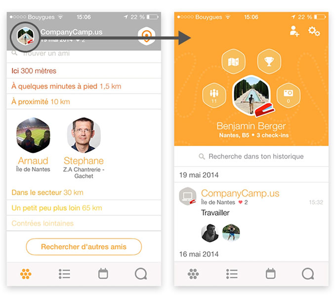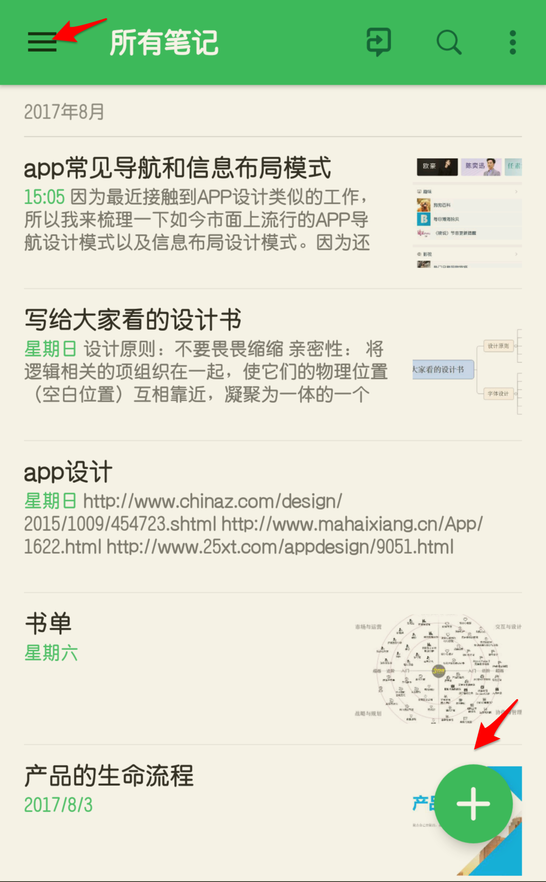 其中,舵式導(dǎo)航中蘊含二級導(dǎo)航標(biāo)簽的標(biāo)簽可以單獨成為一種導(dǎo)航——點聚導(dǎo)航,適用于因為內(nèi)容的展示,要求界面有極高的簡潔性的APP。印象筆記的APP版本就是一個典型的點聚導(dǎo)航,印象筆記是個特別的例子,不僅用點聚導(dǎo)航作為一級導(dǎo)航,還用了抽屜導(dǎo)航作為二級導(dǎo)航,應(yīng)該是為了大程度保持產(chǎn)品的簡潔性。