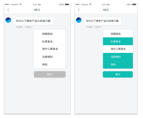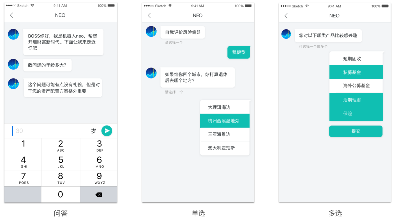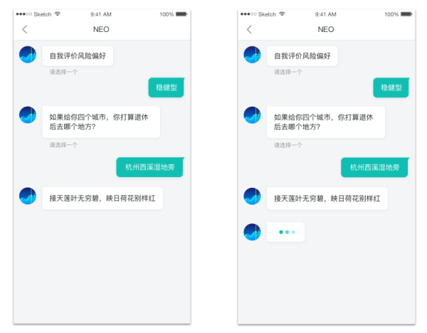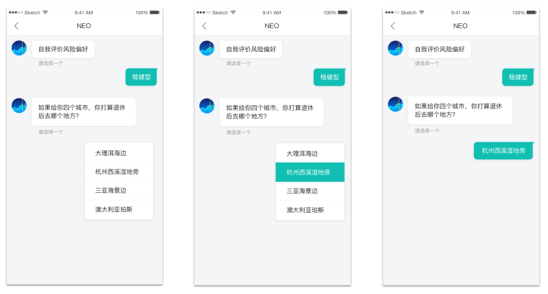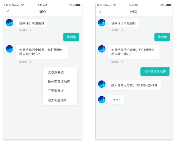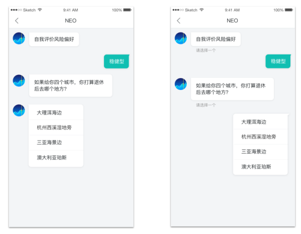 當(dāng)遇到單選題時(shí),Neo先說(shuō)出問(wèn)題,并在用戶會(huì)話的那一側(cè)(右側(cè))顯示出選項(xiàng),這樣用戶就很自然的選擇點(diǎn)擊某一個(gè)選項(xiàng),用戶點(diǎn)擊選擇之后,則會(huì)將該答案作為對(duì)話發(fā)出來(lái)。用戶瀏覽整個(gè)對(duì)話時(shí),看上去還是一問(wèn)一答的對(duì)話形式。