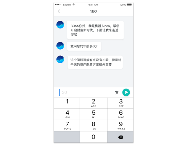 3. 當(dāng)Neo詢問(wèn)年齡時(shí),彈出數(shù)字鍵盤,用戶只可以輸入數(shù)字,在鍵盤上顯示出單位“歲”,默認(rèn)值顯示30,引導(dǎo)用戶輸入,有助于降低用戶的出錯(cuò)率。