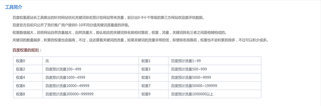 權(quán)重的等級是從1~9,chinaz站長工具給出的計(jì)算公式是通過預(yù)估流量達(dá)到多少而定,例如你的預(yù)估流量是100那么網(wǎng)站權(quán)重就是2,低于100的則是1。