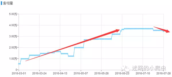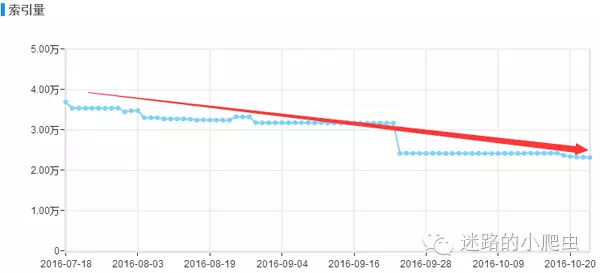 如上圖小編是今年三月份開始接手的這個網(wǎng)站項目,當時并沒有通過逆向思維去解決網(wǎng)站存在的收錄問題,只是經(jīng)驗性的簡單分析了一下網(wǎng)站的日志,在站長后臺增加了sitemap推送和在服務器上部署了主動推送功能,短時間內(nèi)的確效果明顯,該頻道的頁面收錄呈現(xiàn)良好的上升趨勢,可是通過圖表可以看出,收錄量在達到6月份的時候一直到7月份中旬沒有進行任何明顯的變化,從7月中旬之后小編當時就有一種危機感,職業(yè)上的直覺告訴我,接下來一段時間該頻道的收錄會呈現(xiàn)大幅下降的趨勢,結(jié)果果不其然,如下圖:
