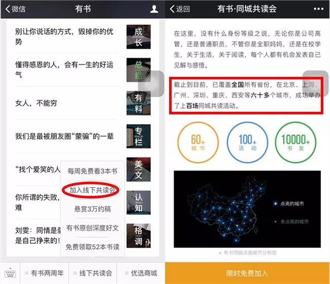 有書策劃過一些活動,比如在建群的早期,為了增加用戶分享社群的動力,會在用戶分享社群之后,贈送給用戶一些精美的電子書。這就帶動粉絲滾雪球似的增長,這些社群遍布全國六十多個(gè)城市,從而吸引線下書友加入。