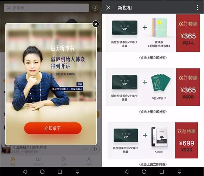 由于得到有APP,而新世相沒有APP,在曝光量方便,得到占據(jù)了很大的優(yōu)勢,比如每次都可以有開機(jī)廣告,而新世相的讀書會迄今只在公眾號上推廣了兩三次,最多將讀書會加在了菜單欄中。