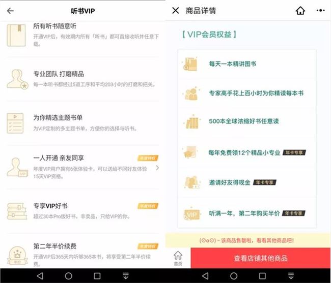 產(chǎn)品提供的權(quán)益比較相似,都是一年可以聽將近 400 本書籍,有很多免費(fèi)的小權(quán)益,第二年半價(jià)續(xù)費(fèi)。由于得到的聽書是最先推出來的,難道是新世相模仿了下羅輯思維的得到?