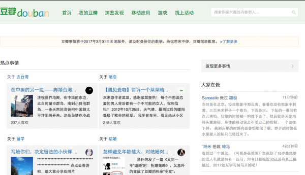 “豆瓣事情將于2017年3月31日關(guān)閉服務(wù),請及時備份你的數(shù)據(jù)。給你帶來不便,豆瓣深表歉意。”