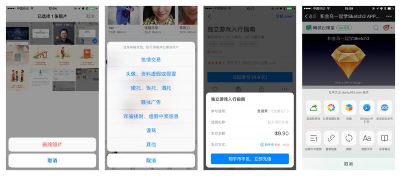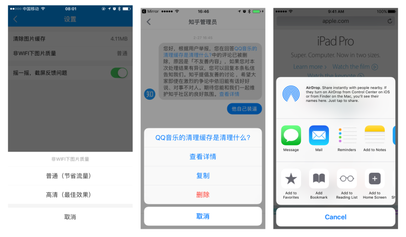 Action Sheet:重要程度弱于Alert時(shí),當(dāng)需要給用戶更多的功能選擇時(shí)使用Action Sheet。一般用戶主動(dòng)發(fā)起任務(wù)時(shí)用 Action Sheet。