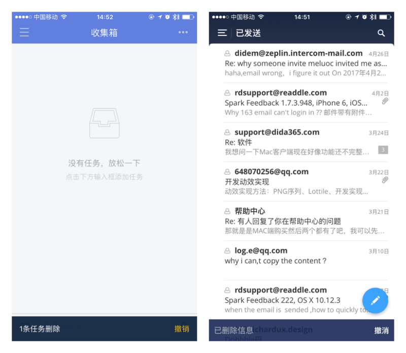 Snackbar使用場景:當(dāng)你刪除收集箱某件任務(wù)時(shí),可以在屏幕底部出現(xiàn)Snackbar,提示“任務(wù)成功刪除”,并附帶撤銷操作,當(dāng)用戶點(diǎn)擊撤銷時(shí),任務(wù)可恢復(fù)。用戶不進(jìn)行操作Snackbar則消失,任務(wù)刪除成功。