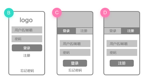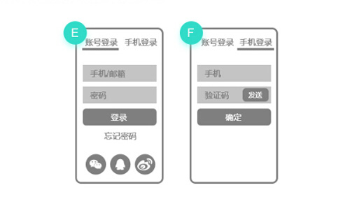 第三種,用戶名或者手機(jī)登錄。這種界面表現(xiàn)形式如圖EF,是一個(gè)標(biāo)簽切換登錄方式。一個(gè)界面上可以切換手機(jī)號(hào)登錄和賬戶登錄兩種方式。這種方式便在臺(tái)面上的說(shuō)法是,為了便于用戶,提供多種登錄選擇。