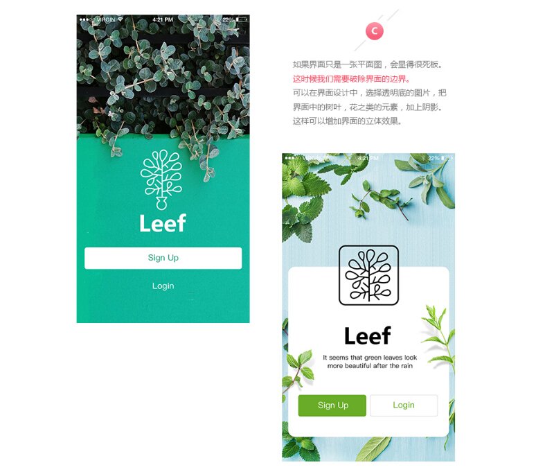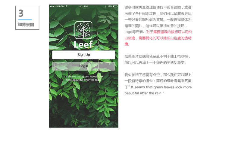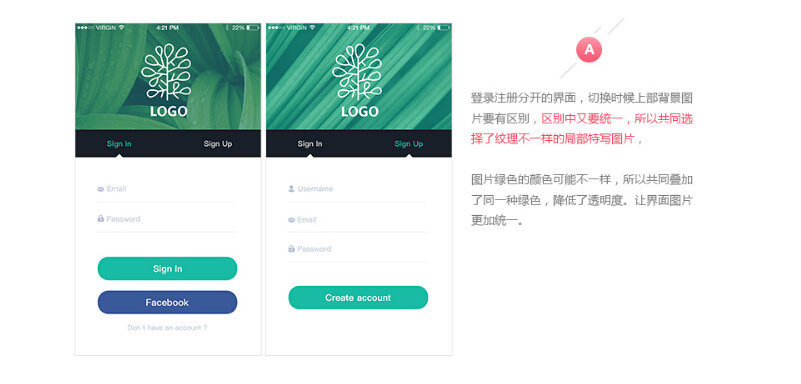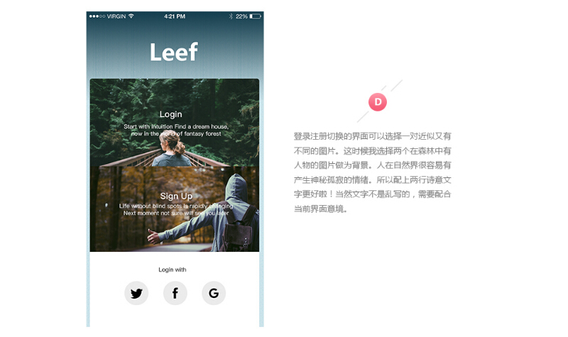 視覺(jué)設(shè)計(jì)前先理清楚界面的邏輯,界面中每個(gè)元素的點(diǎn)擊從哪里來(lái)到哪里去。app因?yàn)楫a(chǎn)品賬號(hào)體系不同的,所以有各種登錄注冊(cè)方式。登錄注冊(cè)有四種方式。每種方式可以采用不同的形式的背景圖設(shè)計(jì)。找圖片有意識(shí)的按不同類型分類去尋找圖片。要善于運(yùn)用一些透明地圖片調(diào)節(jié)界面的維度。讓界面細(xì)節(jié)設(shè)計(jì)更豐富。設(shè)計(jì)師也要學(xué)會(huì)運(yùn)用文字的力量,點(diǎn)睛的文字可以讓界面設(shè)計(jì)增加品質(zhì)感。