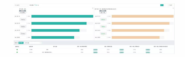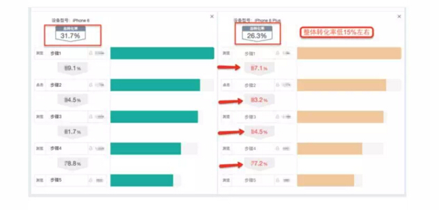分群完了之后,我們把分群應(yīng)用到我之前建好的轉(zhuǎn)化漏斗上,可以得到一個(gè)對(duì)比的數(shù)據(jù)。