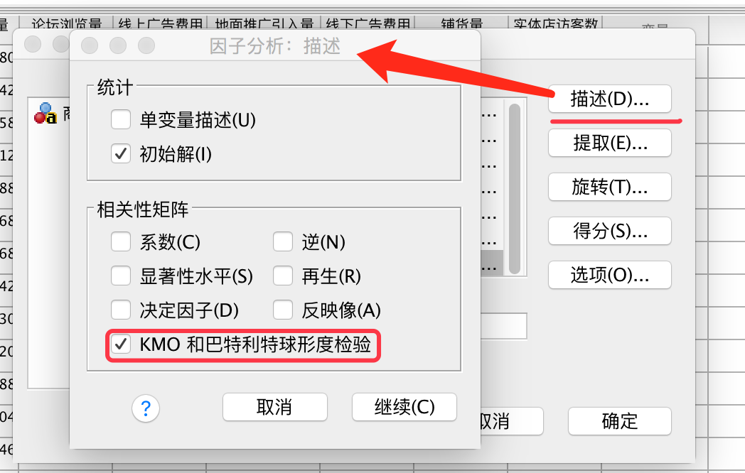 勾選“KOM和巴特利特球形度檢驗”,目的是用于生成檢驗因子分析適合度的統(tǒng)計指標。