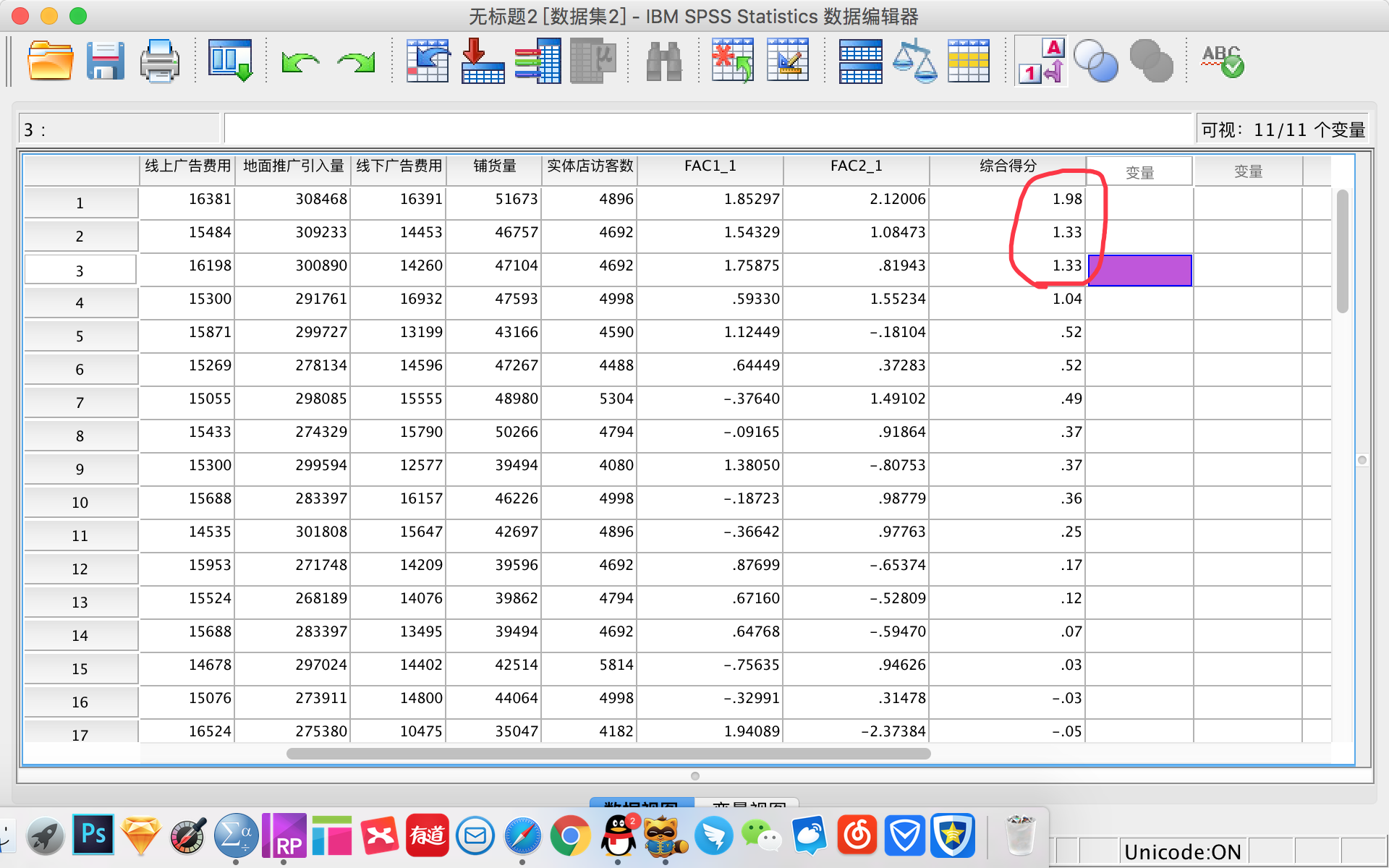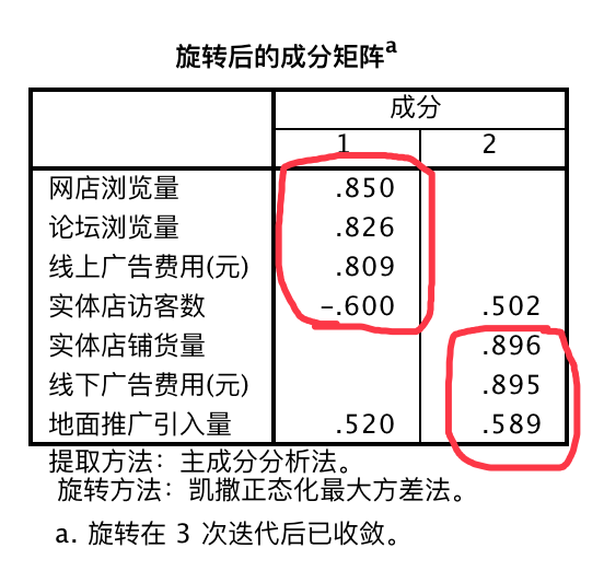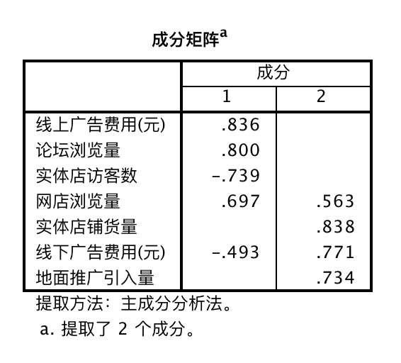 第二個因子:載荷較大的是“實體店鋪貨數(shù)”、“線下廣告費用”、“地面推廣引入量”,說明這個變量與因子的先關(guān)程度較高,并且反映的都是線下情況。綜上所述可以命名為“線下商務(wù)”。